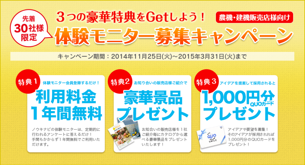 体験モニター会員募集キャンペーン中!皆様こんにちは。ノウキナビ事務局 市川です。 前回のブログは古物商許可証を無駄なく取りに行く! 〜古物商許可証を申請編〜というニッチな内容をお届けしました。今回は残りわずかとなりました農機具販売店様向けのキャンペーンのお知らせです! 【*体験... ノウキナビ