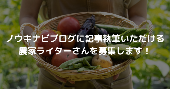 こんにちは。ノウキナビ事務局の神林です。本日は、日頃よりノウキナビをご利用いただいている農家の皆様にご案内です。 ノウキナビでは、ノウキナビブログに記事執筆をしていただける農家ライターさんを募集しています! 農業に関して思うところがある! ... ノウキナビ事務局:K
