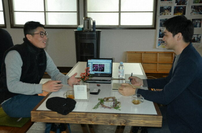 江原宏晃さん(左)の花卉農園のブランディング_20191206の相談に応じる山岸直輝さん=長野県飯綱町牟礼のZQで 台風19号で甚大な被害を受けた北信地方の農業を、農産品のブランディングや加工品開発を通じて復興させることを目指す「北信濃農業復興プ... -