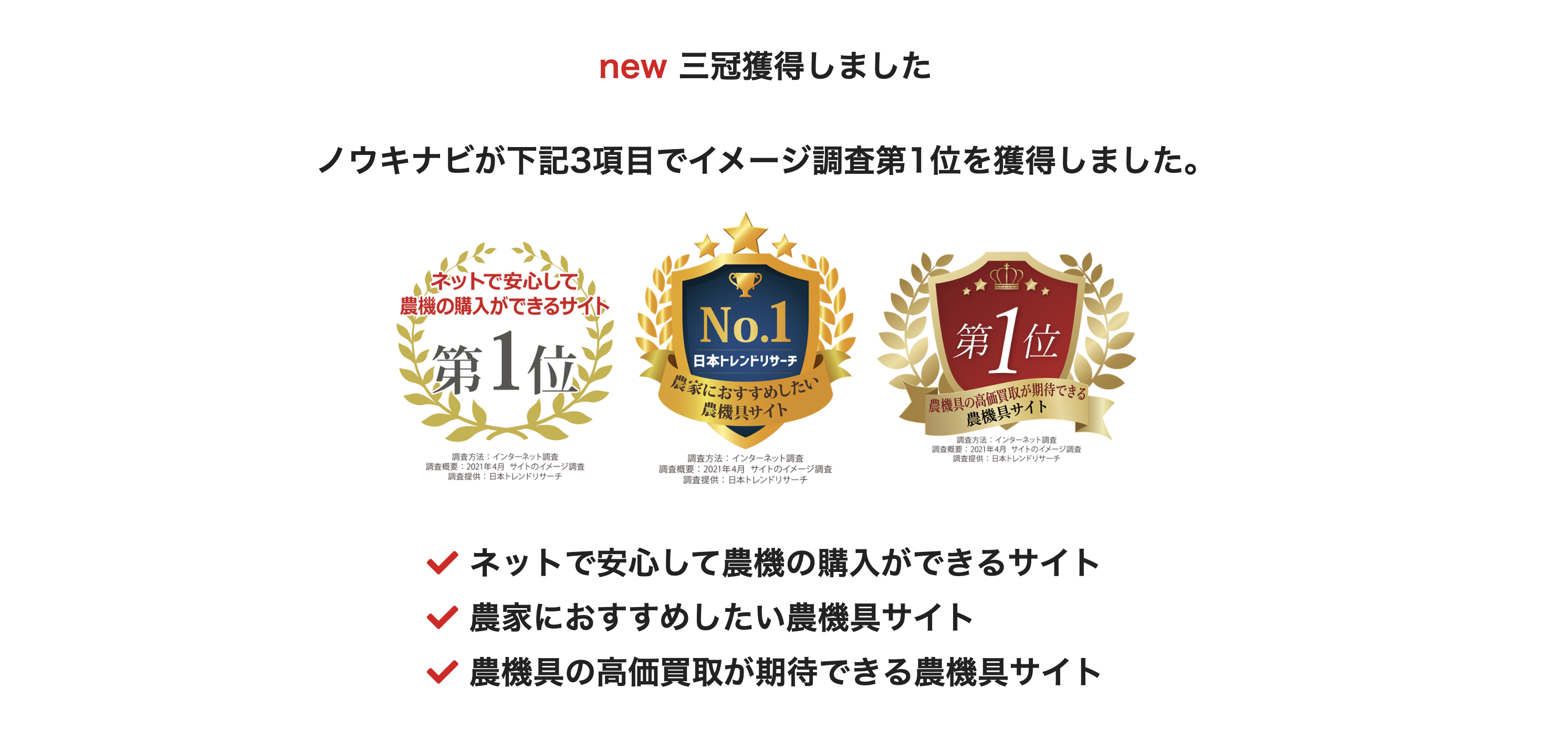 この度、ノウキナビ( https://www.noukinavi.com/ )は、日本トレンドリサーチ(運営会社:株式会社NEXER)が行った男女1200名を対象にした農機具サイトについての調査(https://trend-research.jp/8001/)において、「ネットで安心して農機の購入ができるサイト」「農家におすすめしたい農機具サイト」「農機具の高価買取が期待できる農機具サイト」の3項目で第一位を獲得しました。
