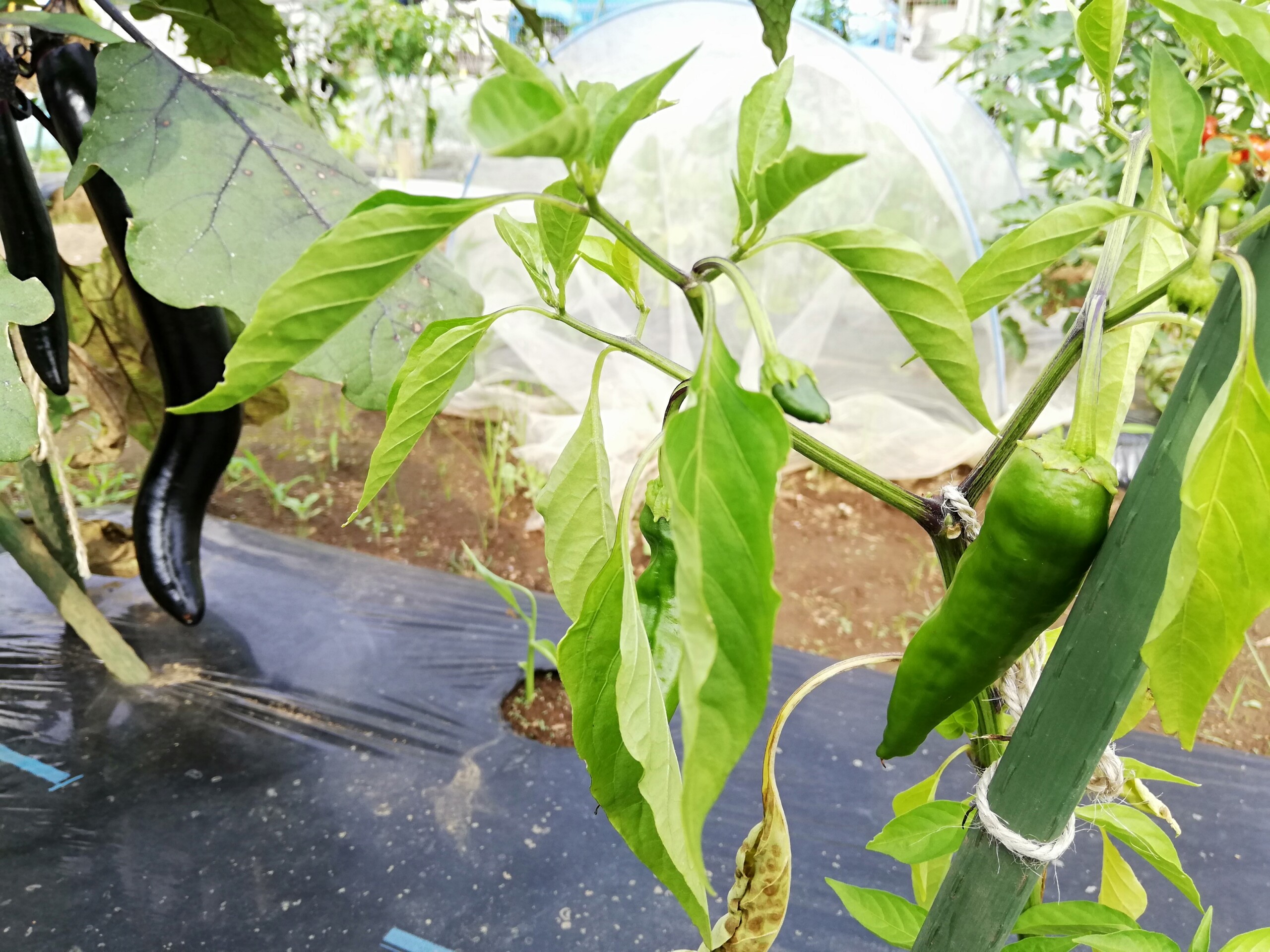 唐辛子を植え付ける2~3週間前に、畝をつくります。その際に、鶏ふんや苦土石灰などのたい肥を土に加え、しっかり混ぜます。空気を入れて、水はけがよく、保水性の高い土づくりを意識しましょう。栽培適温は20℃~30℃です。この時期の畝づくりは過酷ですが、野菜を育てるうえでは重要なポイントですので頑張りましょう!