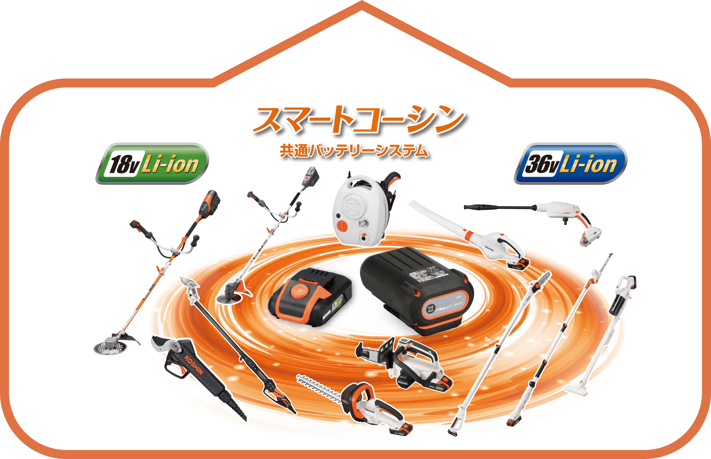 工進のスマートコーシンは大きく9種類の農機具への互換性があるバッテリー式の商品のシリーズを挿します。
