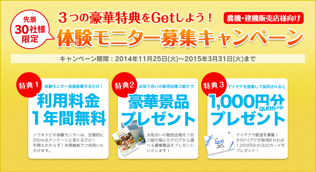 農機・建機販売店様 先着30社限定!体験モニター会員募集キャンペーン