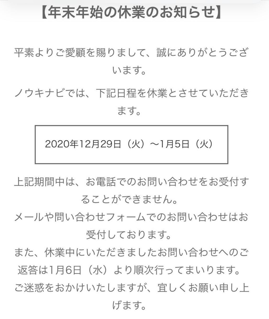 ノウキナビでは2020年12月29日(火)〜1月5日(火)まで休業とさせていただきます。
